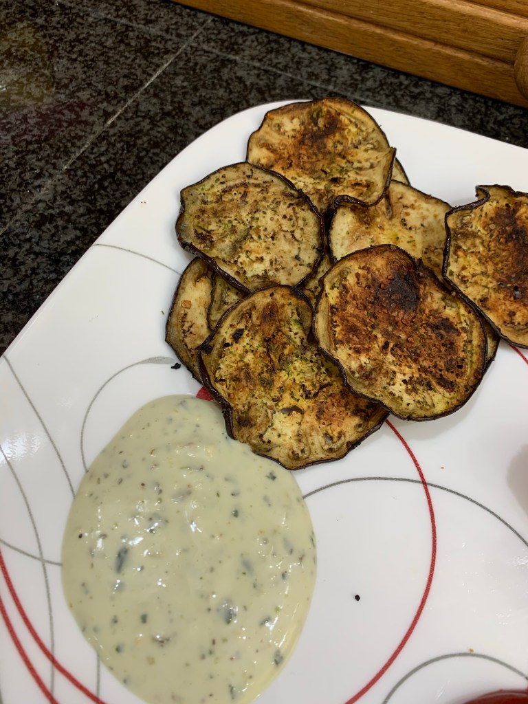 Last but not least, this is a new one too! I’m still having fun experimenting with eggplants! So far, I’ve made eggplant parmesan, eggplant mini pizzas, and most recently eggplant chips. All of these have turned out great! These ones I did make in the oven, but am planning on testing out in the air fryer soon!