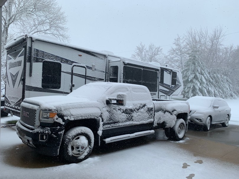 We flew in and started right to work on getting everything ready, new battery in the truck, pulled the RV out, checked all the tires, generator, etc. it had sat thru a long cold (very cold winter) I won’t get into all of the nitty gritty, but basically one of the water lines on the exterior froze and broke, the generator was dead from not being run and wouldn’t work so we had to get a generator to start the generator so we could hook it up to the truck, it was a rough weekend with lots to get done to say the least. So as the weekend was coming to an end we rushed to get everything that we could done so it was an easy departure the next time we flew out to drive it back home. Well Sunday morning came around and our flight was scheduled in the afternoon, we woke up and there was snow….and it was coming down hard and quick!