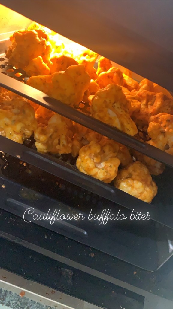 - Add cauliflower to air fryer and cook on 400 for 15 minutes. Please note, cooking times for each air fryer may vary, I have the Instant Vortex Air Fryer! So, I recommend checking on your cauliflower after 5 minutes and adjusting the cooking time if needed! If you find your food in the air fryer burns quickly, turn down the temp! I laid my cauliflower on the baking trays and switched them after about 7 minutes and also flipped the cauliflower when doing so.