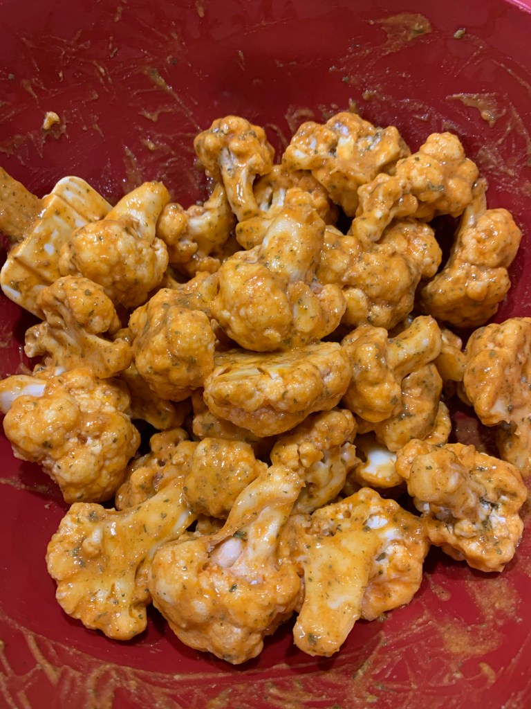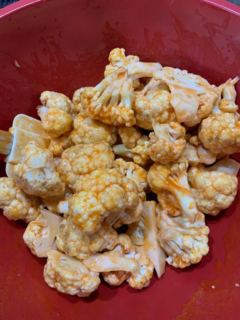 - In a medium sized bowl, combine cauliflower florets, olive oil, and Franks Red Hot Sauce. Mix until cauliflower is fully coated in the mixture.
