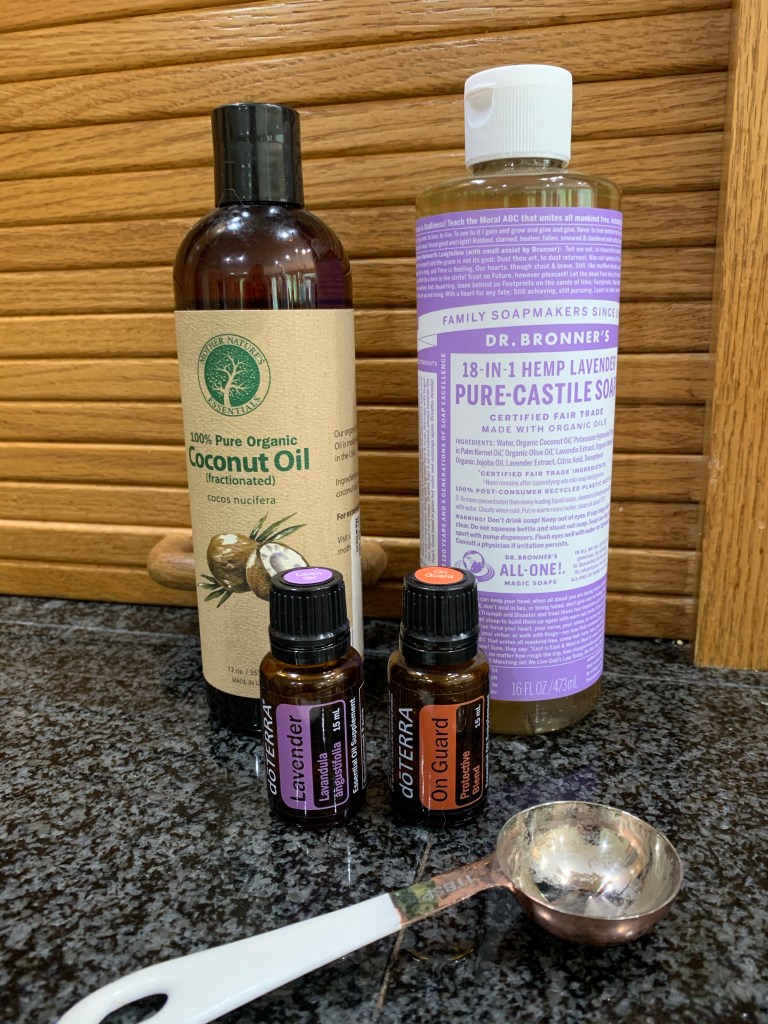- 10 drops of essential oils (I do 5 of lavender and 5 of On Guard for extra bacterial fighting purposes)